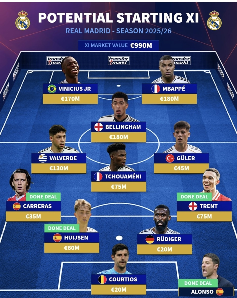 皇家马德里(2025/26 潜在首发|总身价:9.90亿欧元)